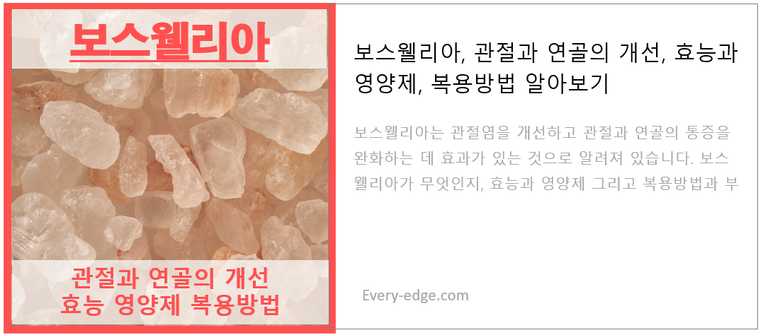 이외에도 관절과 연골의 개선효과가 뛰어난 것으로 잘 알려진 보스웰리아의 효능에 대해 자세히 알고 싶으시다면 아래 포스팅을 확인하시기 바랍니다.